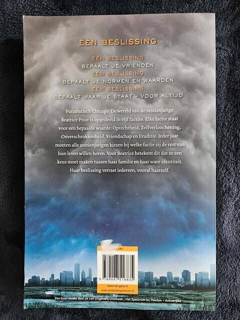Beschrijving: Futuristisch Chicago. De wereld van de zestienjarige Tris is opgedeeld in vijf facties: Oprechtheid, Zelfverloochening, Onverschrokkenheid, Vriendschap en Eruditie. Ieder jaar moeten alle zestienjarigen kiezen bij welke factie zij de rest van hun leven willen horen. Voor Beatrice betekent dit dat ze een keus moet maken tussen haar familie en haar ware identiteit. Haar beslissing verrast iedereen, vooral haarzelf.
