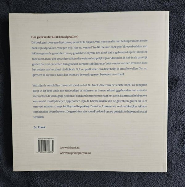 Beschrijving: ‘Het enorme succes van het boek Gezond slank met Dr. Frank had ik nooit kunnen vermoeden. Het dieet dat ik in dat boek heb beschreven was reeds 150 jaar oud en is door mijn team in een nieuw jasje gestoken en her en der onderbouwd met wetenschappelijke informatie. Vanuit mijn praktijk als internist wist ik dat mensen er heel goed op kunnen afvallen en dat zij dit dieet met weinig of minder hongergevoelens konden vol houden. Een veel gestelde vraag was: hoe ga verder als ik 10 kg ben afgevallen?In dit nieuwe boek geef ik je een voorbeeld van zo’n vervolgdieet. Een dieet dat is gebaseerd op het mediterrane dieet en andere wetenschappelijke publicaties. Ik heb zelf met dit dieet veel patiënten verder zien afvallen of hun gewicht stabiel zien weten te houden. Ook nu geldt weer: een dieet helpt je om af te vallen en meer bewegen is belangrijk om op gewicht te blijven of verder af te vallen. In dit boek richten we ons uitsluitend op onze voeding...