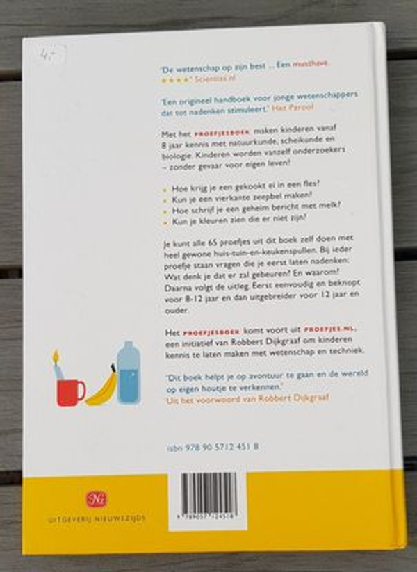 Beschrijving: Met een voorwoord van Robbert Dijkgraaf.'Dat je zelf dingen kunt uitproberen en over dingen kunt nadenken is de beste uitvinding die de mens ooit heeft gedaan. Zo gauw je daaraan begint, is er geen stoppen aan: je blijft onderzoeken en puzzelen. ... Dit boek helpt je op avontuur te gaan en de wereld op eigen houtje te verkennen.'- Uit het voorwoord van Robbert DijkgraafMet het Proefjesboek maken kinderen vanaf 8 jaar kennis met natuurkunde, scheikunde en biologie. Kinderen worden vanzelf onderzoekers - zonder gevaar voor eigen leven!* Hoe krijg je een gekookt ei in een fles?* Kun je een vierkante zeepbel maken?* Hoe schrijf je een geheim bericht met melk?* Kun je kleuren zien die er niet zijn?Je kunt alle 65 proefjes uit dit boek doen met heel gewone huis-tuin-en-keukenspullen. Bij ieder proefje staan vragen die je eerst laten nadenken: Wat denk je dat er zal gebeuren? En waarom? Daarna volgt de uitleg. Eerst eenvoudig en beknopt voor 8-12 jaar en dan uitgebreider voor 12 jaar en ouder...