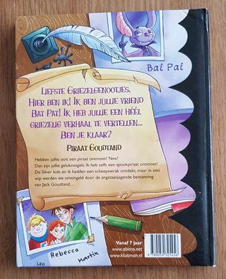Beschrijving: Liefste griezelgenootjes, Hier ben ik! Ik ben jullie vriend Bat Pat! Ik heb jullie een héél griezelig verhaal te vertellen... ben je klaar? Hebben jullie ooit een piraat ontmoet? Nee? Dan zijn jullie geluksvogels. Ik heb zelfs een spookpiraat ontmoet! De Silver kids en ik hadden een scheepswrak ontdekt, maar in een wip werden we omsingeld door de angstaanjagende bemanning van Jack Goudtand…