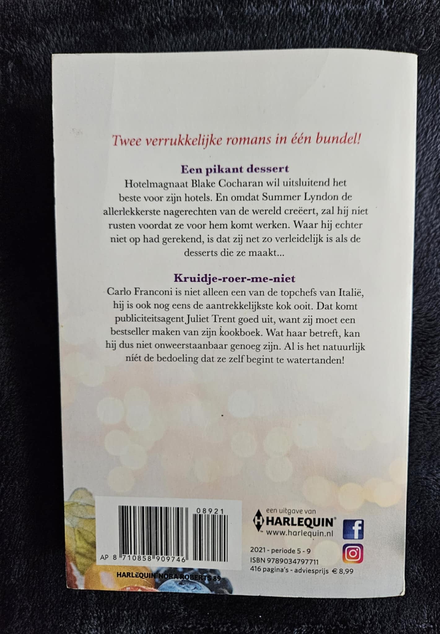 Beschrijving: Twee culinaire romans in één verrukkelijke bundel! (1) Een pikant dessert: Hotelmagnaat Blake Cocharan wil uitsluitend het allerbeste voor zijn hotels. En omdat Summer Lyndon de allerlekkerste desserts van de wereld creëert, zal hij niet rusten voordat ze voor hem komt werken. Waar hij alleen niet op had gerekend, is dat zij net zo verleidelijk is als de desserts die ze maakt... (2) Kruidje-roer-me-niet: Carlo Franconi is niet alleen een van de topchefs van Italië, hij is ook nog eens de aantrekkelijkste kok ooit. Dat komt publiciteitsagent Juliet Trent goed uit, want zij moet een bestseller maken van zijn boek. Wat haar betreft kan hij dus niet onweerstaanbaar genoeg zijn. Maar het is natuurlijk niet de bedoeling dat ze zélf begint te watertanden!
