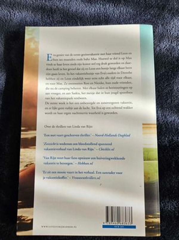 Beschrijving: Eva geniet van de eerste gezinsvakantie met haar vriend Leon en hun zes maanden oude baby Max. Hoewel ze dol is op Max vindt ze haar leven sinds zijn komst wel erg druk geworden en daardoor heeft ze het gevoel dat zij en Leon een beetje langs elkaar heen zijn gaan leven. In het vakantiehuisje van Eva's ouders in Drenthe hebben zij en Leon eindelijk weer eens echt alle tijd voor elkaar, en voor Max. Ze ontmoeten Ron en Nienke, hun oude vrienden, die nu de camping beheren. Met elkaar halen ze herinneringen op aan vroeger, en aan Saskia, het meisje dat in hun jeugd spoorloos van het vakantiepark verdween. De eerste week is het een onbezorgde en zonovergoten vakantie, en er lijkt geen vuiltje aan de lucht. Tot Eva op een ochtend wakker wordt en haar ergste nachtmerrie waarheid is geworden.
