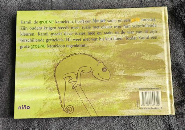 Beschrijving: Het verhaal gaat over Kamil, de groene kameleon. Kamil heeft een blauwe vader en een gele moeder. In het verhaal worden de gevoelens van Kamil beschreven wanneer zijn ouders steeds meer ruzie krijgen met elkaar over hun verschillende kleuren. Gevoelens van angst, verdriet en boosheid lopen door elkaar. Kamil raakt ervan in de war en heeft het gevoel dat hij het nooit goed kan doen voor allebei. Uiteindelijk komt Kamil bij een grote, wijze kameleon terecht die hem uitleg geeft over de verschillende gevoelens en antwoord probeert te geven op de vragen die hij heeft. Op deze manier komen thema's als echtscheiding, machteloosheid en schuld aan de orde. De grote, wijze kameleon kan Kamil geen oplossing geven voor zijn situatie, maar door de uitleg en de steun voelt Kamil zich wel een beetje beter.