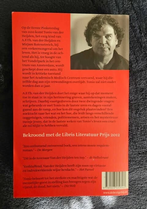 Beschrijving: Op de Eerste Pinksterdag van 2010 komt Tonio van der Heijden, het enig kind van A.F.Th. van der Heijden en Mirjam Rotenstreich, bij een verkeersongeval om het leven. Het is vroeg in de ochtend als hij, ter hoogte van het Vondelpark in het centrum van Amsterdam, wordt geschept door een auto. Hij wordt in kritieke toestand naar het Academisch Medisch Centrum vervoerd, waar hij diezelfde dag aan zijn verwondingen overlijdt. Tonio zal niet ouder worden dan 21 jaar.A.F.Th. van der Heijden doet het enige waar hij op dat moment toe in staat is: in zijn herinnering graven, aantekeningen maken, schrijven. Daarbij voortgedreven door twee dwingende vragen: wat gebeurde er met Tonio in de laatste uren en dagen voorafgaand aan de ramp, en hoe kon dit ongeluk plaatsvinden? Een zoektocht naar het wat en het hoe, die leidt langs verschillende ooggetuigen, vrienden, politiemensen, artsen en het mysterieuze meisje Jenny, dat in de laatste weken van Tonio s leven een cruciale rol blijkt te hebben vervuld...