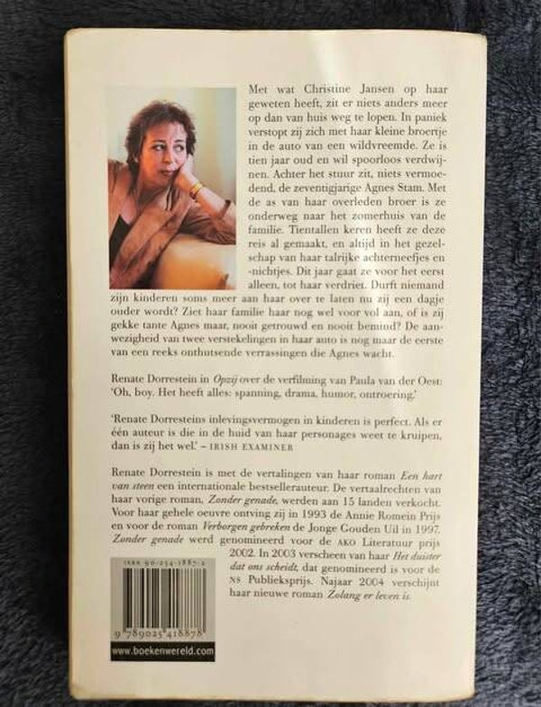Beschrijving: Met wat Christine Jansen op haar geweten heeft, zit er niets anders meer op dan van huis weg te lopen. In paniek verstopt zij zich met haar kleine broertje in de auto van een wildvreemde. Ze is tien jaar oud en wil spoorloos verdwijnen. Achter het stuur zit, niets vermoedend, de zeventigjarige Agnes Stam. Met de as van haar overleden broer is ze onderweg naar het zomerhuis van de familie. Tientallen keren heeft ze deze reis al gemaakt, en altijd in het gezelschap van haar talrijke achterneefjes en - nichtjes. Dit jaar gaat ze voor het eerst alleen, tot haar verdriet. Durft niemand zijn kinderen soms meer aan haar over te laten nu zij een dagje ouder wordt? Ziet haar familie haar nog wel voor vol aan, of is zij gekke tante Agnes maar, nooit getrouwd en nooit bemind? De aanwezigheid van twee verstekelingen in haar auto is nog maar de eerste van een reeks onthutsende verrassingen die Agnes wacht.