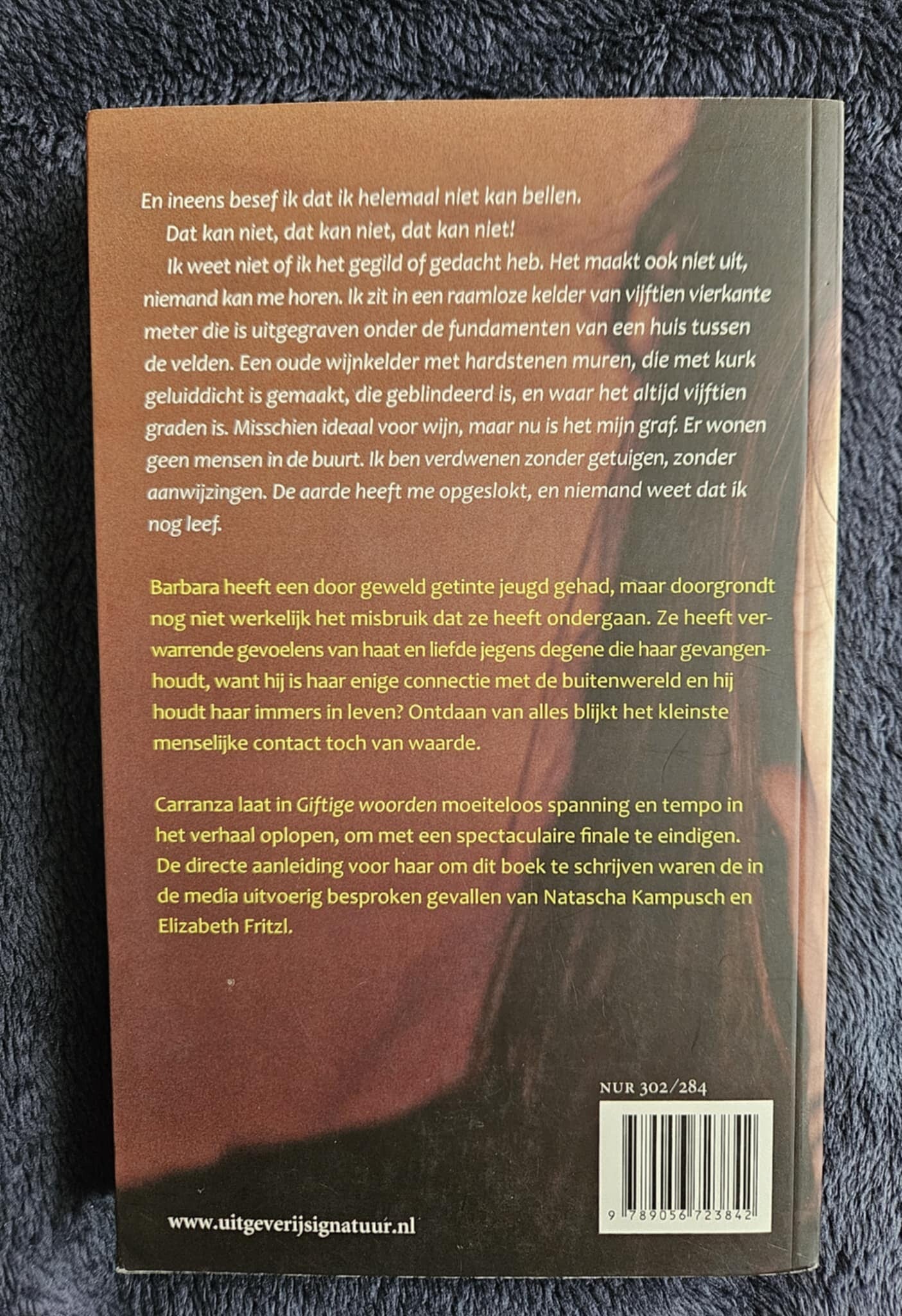 Beschrijving: En ineens besef ik dat ik helemaal niet kan bellen. Dat kan niet, dat kan niet, dat kan niet! Ik weet niet of ik het gegild of gedacht heb. Het maakt ook niet uit, niemand kan me horen. Ik zit in een raamloze kelder van vijftien vierkante meter die is uitgegraven onder de fundamenten van een huis tussen de velden. Een oude wijnkelder met hardstenen muren, die met kurk geluiddicht is gemaakt, die geblindeerd is, en waar het altijd vijftien graden is. Misschien ideaal voor wijn, maar nu is het mijn graf. Er wonen geen mensen in de buurt. Ik ben verdwenen zonder getuigen, zonder aanwijzingen. De aarde heeft me opgeslokt, en niemand weet dat ik nog leef.Barbara heeft een door geweld getinte jeugd gehad, maar doorgrondt nog niet werkelijk het misbruik dat ze heeft ondergaan. Ze heeft verwarrende gevoelens van haat en liefde jegens degene die haar gevangenhoudt, want hij is haar enige connectie met de buitenwereld en hij houdt haar immers in leven? Ontdaan van alles, blijkt het kleinste menselijke contact toch van waar...