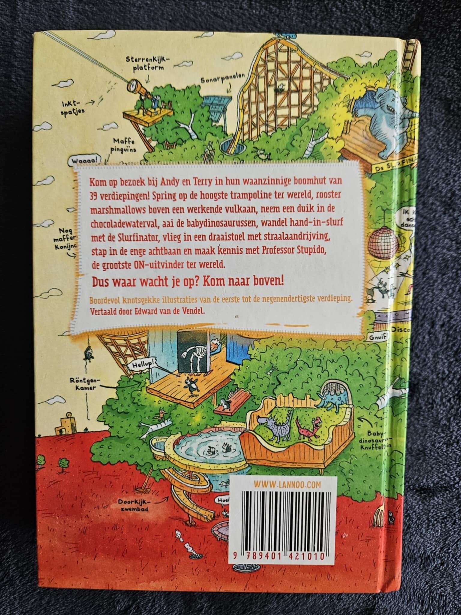 Beschrijving: Als je dacht dat de boomhut niet nóg hoger kon, dan heb je het goed mis! De boomhut is uitgebreid met maar liefst dertien gloednieuwe verdiepingen. Kom op bezoek bij Andy en Terry in hun waanzinnige boomhut van 39 verdiepingen! Spring op de hoogste trampoline ter wereld, rooster marshmallows boven een werkende vulkaan, neem een duik in de chocoladewaterval, aai de babydinosaurussen, wandel hand-in-slurf met de Slurfi nator, vlieg met een draaistoel met propelleraandrijving, stap in de enge achtbaan en maak kennis met Professor Stupido, de grootste ON-uitvinder van de wereld. Dus waar wacht je nog op? Kom naar boven!!!