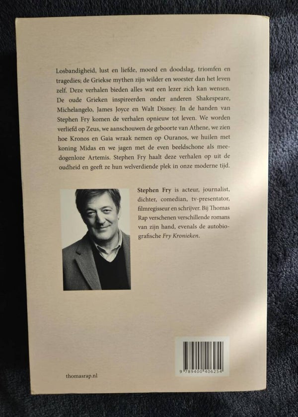 Beschrijving: Losbandigheid, lust en liefde, moord en doodslag, triomfen en tragedies; de Griekse mythen en sagen zijn wilder en woester dan het leven zelf. Deze verhalen bieden alles wat een lezer zich kan wensen. De oude Grieken inspireerden onder anderen Shakespeare, Michelangelo, James Joyce en Walt Disney. In de handen van Stephen Fry komen de verhalen opnieuw tot leven. We worden verliefd op Zeus, we aanschouwen de geboorte van Athena, we zien hoe Kronos en Gaia wraak nemen op Ouranos, we huilen met koning Midas en we jagen met de even beeldschone als meedogenloze Artemis. Stephen Fry haalt deze verhalen op uit de oudheid en geeft ze hun welverdiende plek in onze moderne tijd.