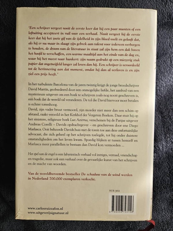 Beschrijving: Een schrijver vergeet nooit de eerste keer dat hij een paar munten of een loftuiting accepteert in ruil voor een verhaal. Nooit vergeet hij de eerste keer dat hij het zoete gif van de ijdelheid in zijn bloed voelt en gelooft dat, als hij er nu maar in slaagt zijn gebrek aan talent voor iedereen verborgen te houden, de droom van de literatuur in staat zal zijn hem een dak boven het hoofd te verschaffen, een warme maaltijd aan het einde van de dag en, waar hij het meest naar hunkert: zijn naam gedrukt op een miezerig stuk papier dat ongetwijfeld langer zal leven dan hij. Een schrijver is veroordeeld tot de herinnering aan dat moment, omdat hij dan al verloren is en zijn ziel een prijs heeft.In het turbulente Barcelona van de jaren twintig krijgt de jonge broodschrijver David Martín, geobsedeerd door een onmogelijke liefde, het aanbod van een mysterieuze uitgever om een boek te schrijven zoals nog nooit geschreven is, een boek dat de wereld zal veranderen...