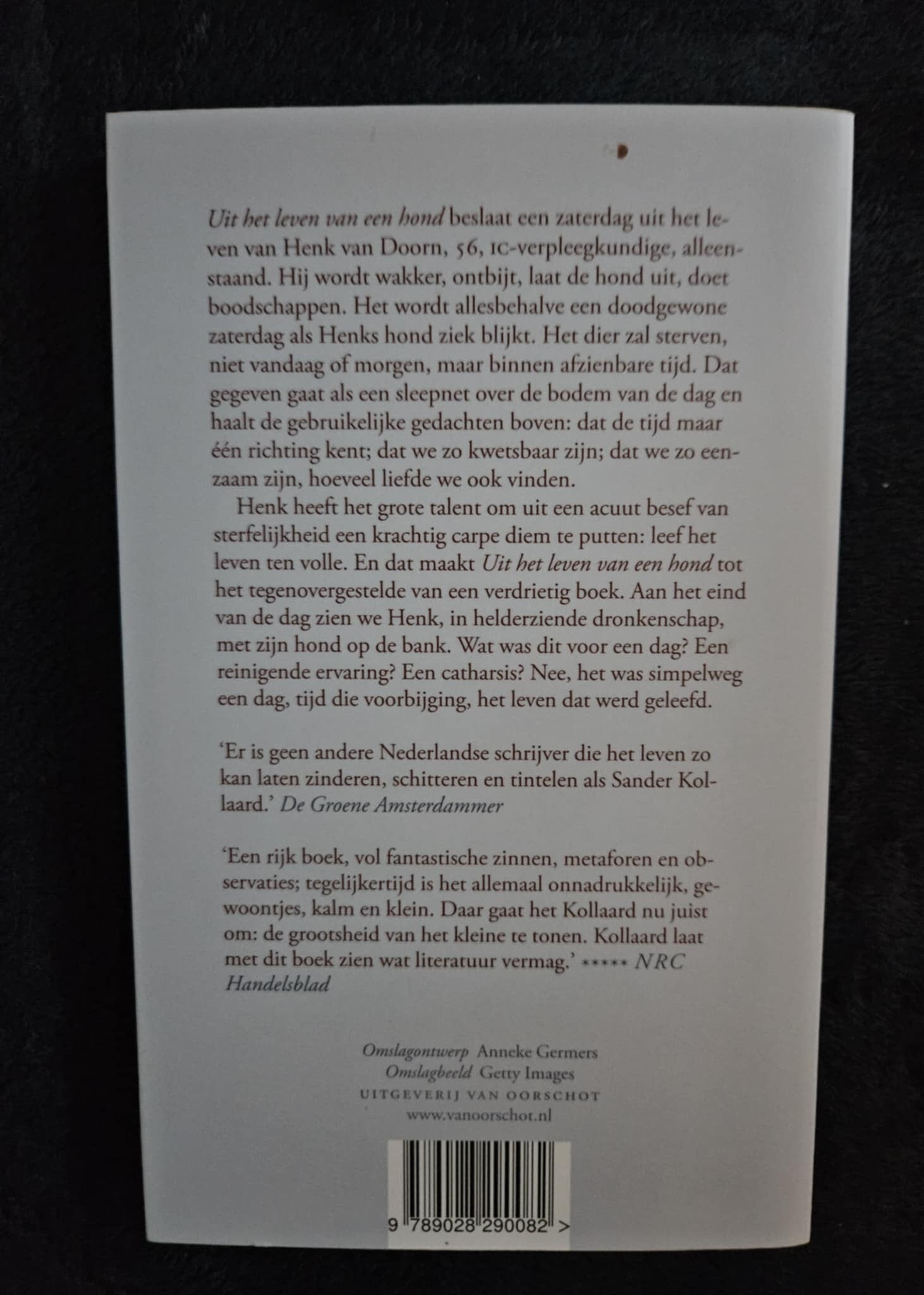 Beschrijving: Uit het leven van een hond beslaat een zaterdag uit het leven van Henk van Doorn, 56, IC-verpleegkundige, alleenstaand. Hij wordt wakker, ontbijt, laat de hond uit, doet boodschappen. Het wordt allesbehalve een doodgewone zaterdag als Henks hond ziek blijkt. Het dier zal sterven, niet vandaag of morgen, maar binnen afzienbare tijd. Dat gegeven gaat als een sleepnet over de bodem van de dag en haalt de gebruikelijke gedachten boven: dat de tijd maar één richting kent; dat we zo kwetsbaar zijn; dat we zo eenzaam zijn, hoeveel liefde we ook vinden. Henk heeft het grote talent om uit een acuut besef van sterfelijkheid een krachtig carpe diem te putten: leef het leven ten volle. En dat maakt Uit het leven van een hond tot het tegenovergestelde van een verdrietig boek. Aan het eind van de dag zien we Henk, in helderziende dronkenschap, met zijn hond op de bank. Wat was dit voor een dag? Een reinigende ervaring? Een catharsis? Nee, het was simpelweg een dag, tijd die voorbijging, het leven dat werd geleefd.