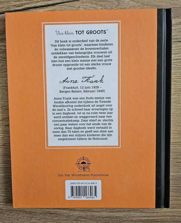 Beschrijving: (Frankfurt, 12 juni 1929 – Bergen-Belsen, februari 1945) Anne Frank was een Duits meisje van Joodse afkomst dat tijdens de Tweede Wereldoorlog onderdook uit angst voor de nazi’s. Ze schreef haar ervaringen op in een dagboek, tot ze na ruim twee jaar werd ontdekt en weggevoerd naar een concentratiekamp. Daar stierf ze, slechts een paar weken voor het einde van de oorlog. Haar dagboek werd vertaald in meer dan 70 talen en geeft een stem aan meer dan een miljoen kinderen die zijn omgekomen tijdens de Holocaust.